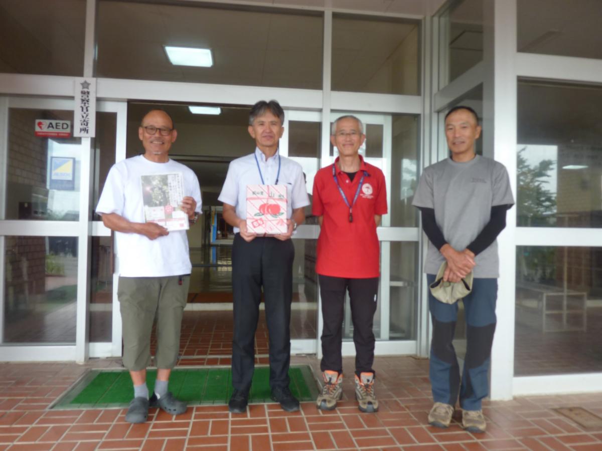 また、本日お昼過ぎにも突然のうれしい来校者が。定期的に子どもたちの遊びの支援に来ていただいてるチーム八ヶ岳の皆さんが、10月中旬に蛸島町・高倉彦神社で実施を予定しているツリークライミングのご準備に来られたということで、本校に立ち寄って下さいました。お土産に桃もいただきました。日時等が正式に決まり次第、子どもたちは案内する予定です。この暑い中、長野県からのご来校に深く感謝、感謝です!