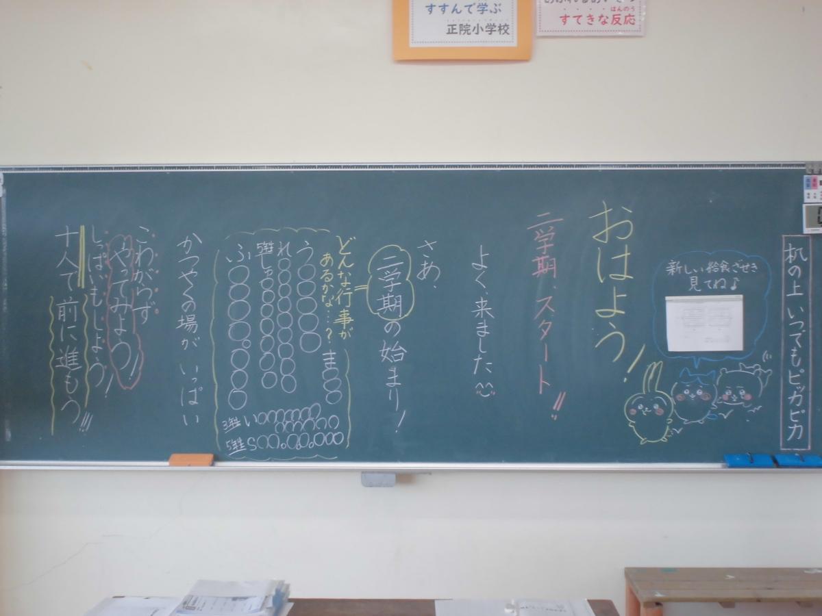 1日(月)、今日も8月とは変わらない暑さを感じる晴れた朝となりました。44日間の夏休みが終わり、今日から2学期が始まりました。朝の教室をのぞくと黒板には、担任からのメッセージや掲示が。今日からまたがんばるぞ、と思わせる仕掛けがそこにありました、素敵です!