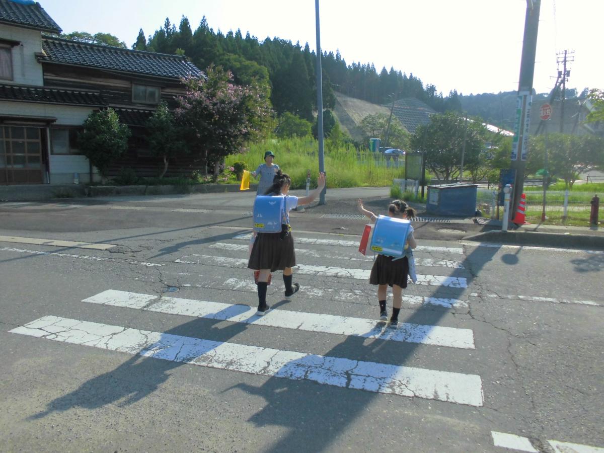 子どもたちは全員元気に、夏休みの宿題等たくさんの荷物を持って登校してくれました。今日は全員元気に登校してくれただけで花丸◎!今月から、朝の交通安全指導に婦人会の皆様がご協力いただけることになりました。地震前にも毎週月曜日には、通学路に立って見守って下さっていた皆さんです。少しずつ日常が戻り度に感じることは感謝!本当にありがたく思います。