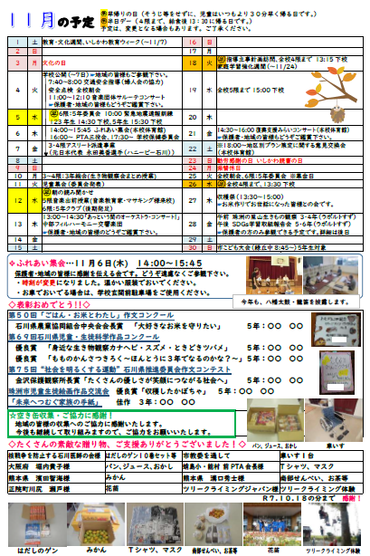 ☆本校の児童への性暴力等の防止に関する取組☛保護者用.pdf →被害を受けたら相談を!…いしかわ性暴力被害者支援センター「パープルサポートいしかわ」☛クリック ☆R7_正院小PTA年間活動計画(0514版)☛R7活動計画 修正版.pdf ☆石川県の感染症発生動向調査情報☛クリック ☆空き缶収集・ご協力のお願い[継続]☛クリック ☆12月の予定