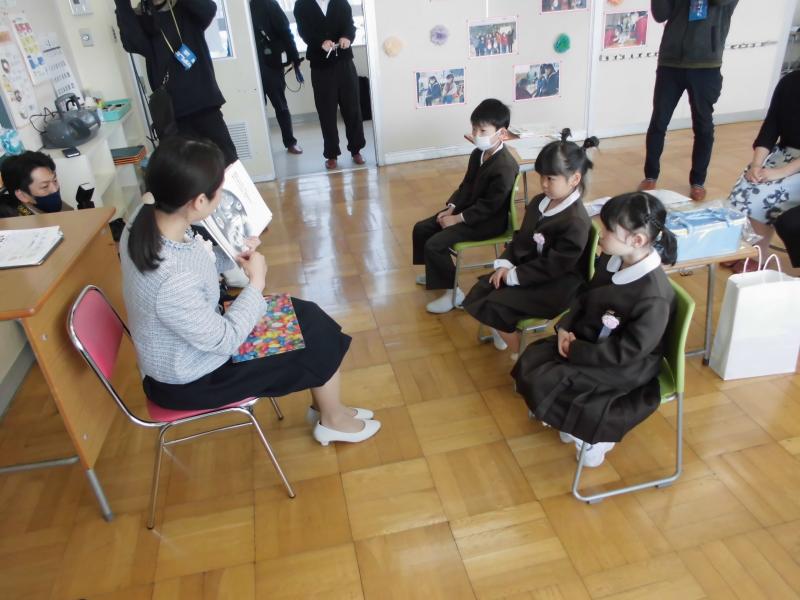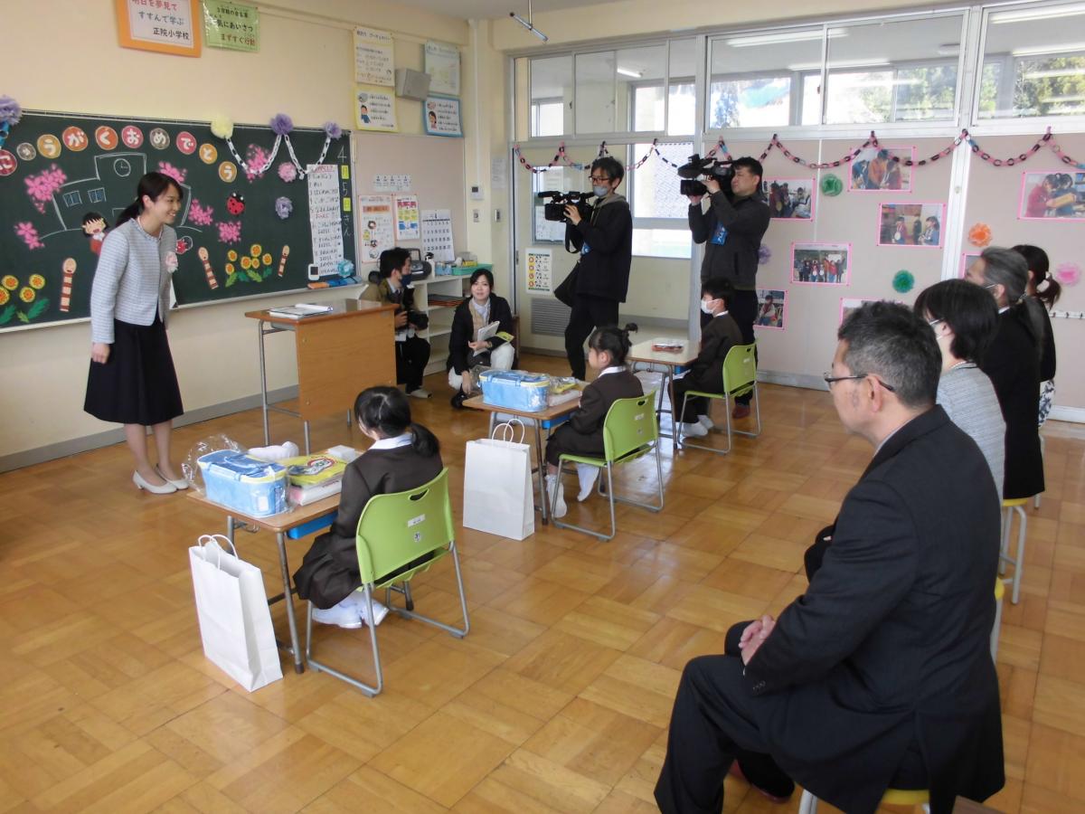 式の後、新入生は、教室でランドセルカバー贈呈式と、これからのことや今日お配りしたものについて、保護者の方と一緒に担任からお話を聞きました。同じクラスの2年生も一緒です。たくさんの取材陣に囲まれ、最後まで緊張していたようでしたが、よくがんばっていました。