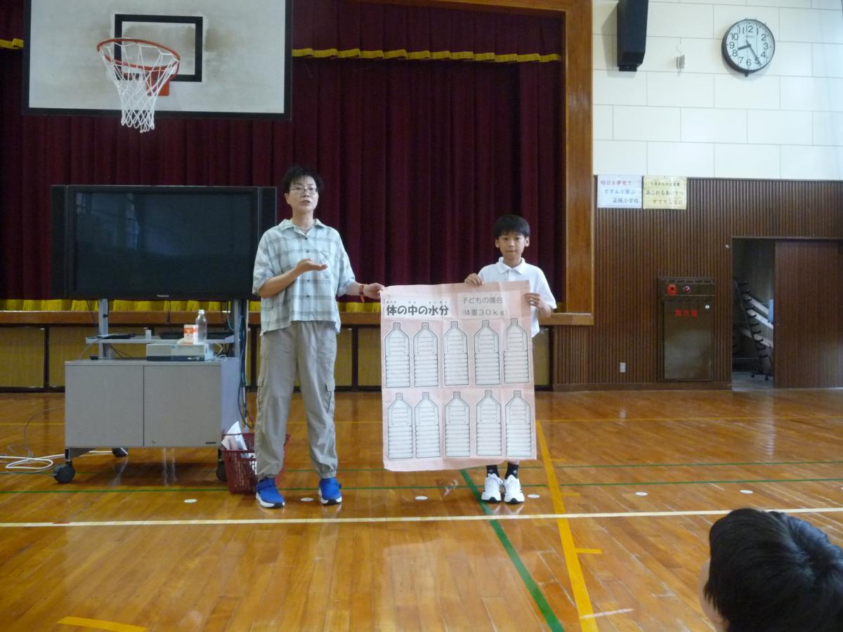 最後に養護教諭の先生から、熱中症にならないためのお話を聞きました。なぜ水分補給が大切なのか、どのように水分補給をするとよいのかを、実物等をつかって分かりやすくお話していただきました。これから毎日暑い日が続きそうです。子どもたちが熱中症とならないように、自分でこまめに水分補給できるようになってくれると嬉しいです。