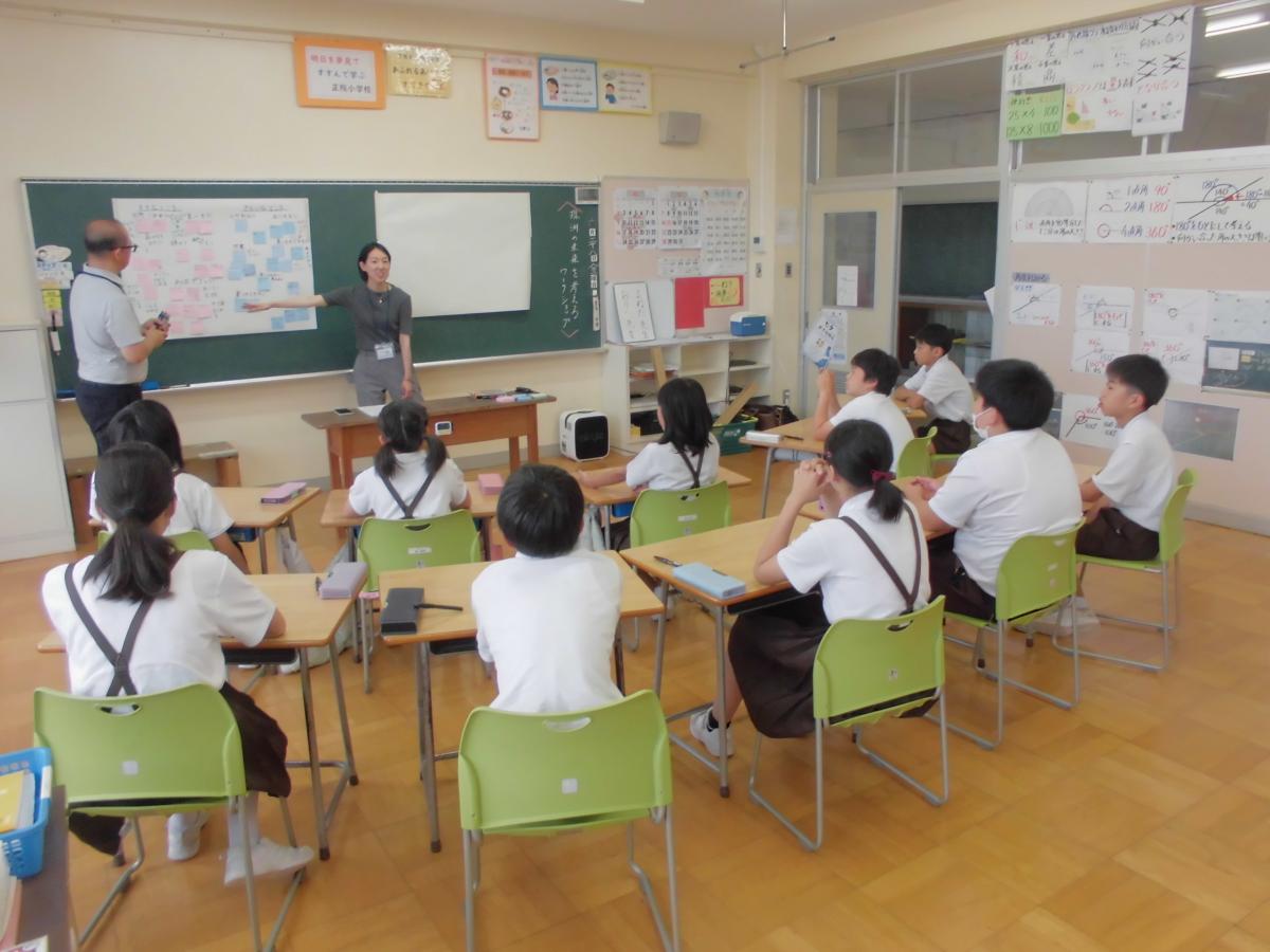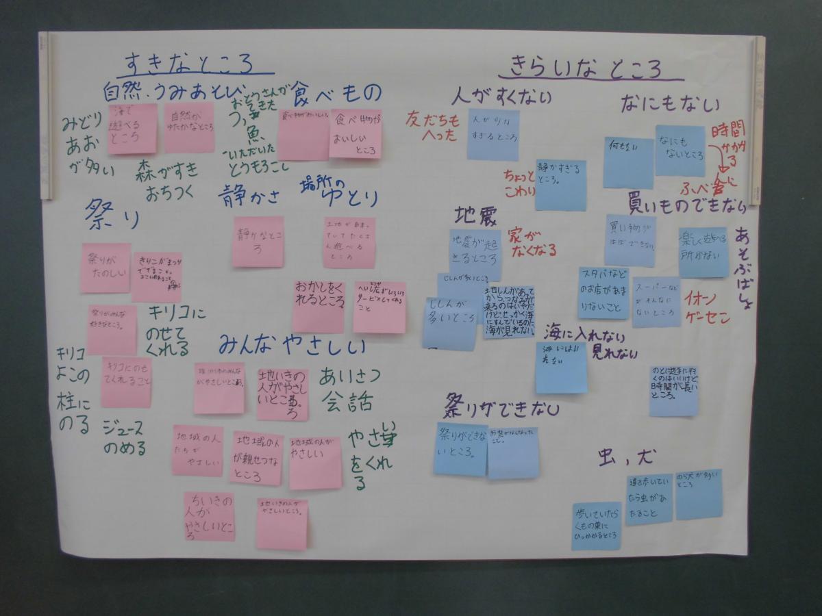 28日(金)の3限目、珠洲市教育委員会からの依頼で、金沢市から計画情報研究所様が来校され、4・6年生を対象に標記のワークショップが開催されました。珠洲市の将来を担う子どもたちが町づくりについて考える機会として取り組みます。市内11校全てを回って、「珠洲市の好きなところ」「珠洲市の嫌いなところ」「珠洲市に住み続けたいか」について互いの考えを出し合い、話し合うことができました。