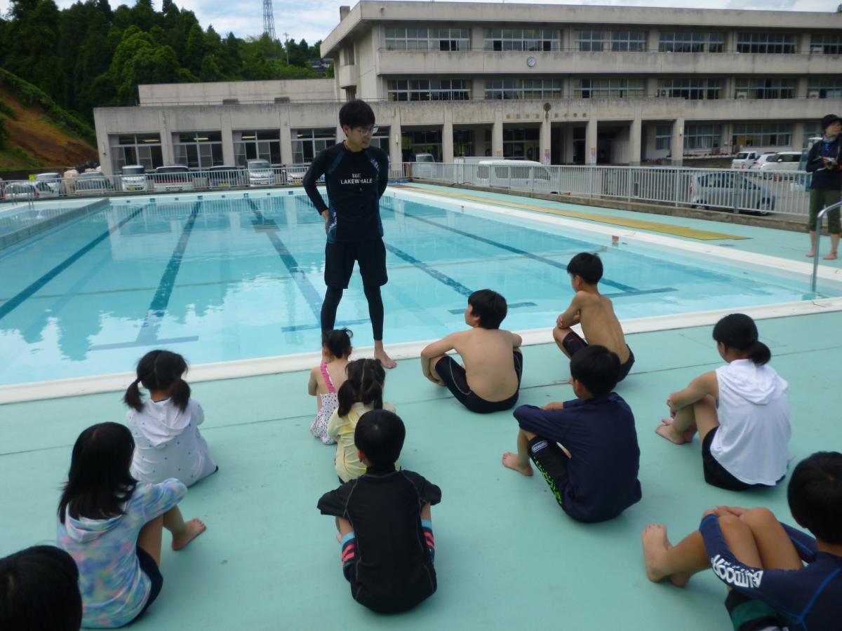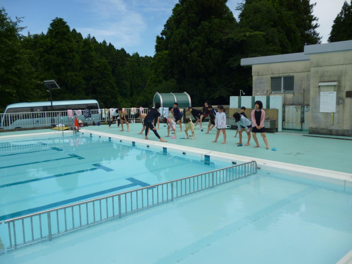 子ども達は、給食を終えると、すぐに着替えて準備万端!飯田小学校に着くと、みんなで職員室に挨拶して、早速プールに入る準備です。体操を丁寧にして、シャワーを浴びたら、1~2年生と4~6年生に分かれて水泳学習です。実際授業1コマ分ほどの時間しかありませんでしたが、子ども達は暑さの中水に入る楽しさを満喫しながら楽しんで活動していました。