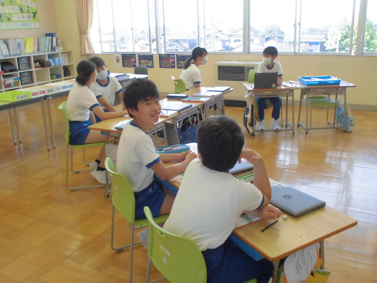 1限目の様子をのぞくと、1年生は国語、説明文の学習です。「つぼみ」を題材に、せつめいのしかたを学んでいました。2年生は国語、読み物教材「スイミー」を先生と交互に1文読みをしていました。4年生は国語、「一つの花」の学習です。戦争について扱ったお話ですが、先生から「おとなになれなかった弟たちに」という本を紹介され、その内容について聞き入る姿が見られました。6年生も国語、「文の組み立て」の学習です。短歌・五七五七七の形の中に、自分の楽しみについて、短く表現する学習のスタートの場面でした。どの学年もみんな学習に集中している様子が見られました。