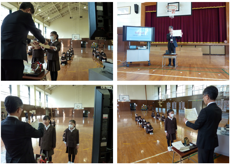 ①表彰・納賞では、5つの表彰・納賞がありました。⑴「新聞を読んで」感想文コンクールで4年生が優秀賞、⑵県理科作品展で1年生が優良賞、⑶JA共済交通安全ポスターコンクールで4年生が佳作、⑷JAお米の作文コンクールで4年生が入賞・4年生が入選、⑸市に寄贈されたマイクロバスデザインで4年生・6年生が入賞でした。また、⑴「新聞を読んで」感想文コンクールでは、優秀学校賞もいただいたことを報告しました。みなさん、よく頑張りましたね!花丸◎