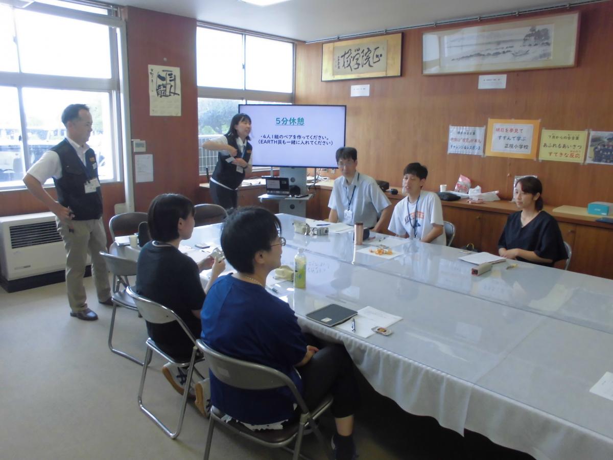 30日(火)の午後は、2組の来校者がおいでました。1組目は、兵庫県から震災・学校支援チーム・アース様が6名来校されました。今回、本校への来校目的は2つ、児童の心のケアと職員研修です。6名のうち2名は、この日学校に来ていた児童と一緒に汗を流したり、学習の支援をして下さったりしました。当初緊張気味だった子どもたちは、最後は打ち解け合っていました。職員研修では、本校職員の心のケアのためのプログラムをすすめて下さいました。グループをつくり、互いの思いをありのままに話し合う中で、少しずつ心のコリがほぐれていくようだと感じました。最後には、アーズの皆様の経験からいろいろなことも学びました。まずは職員が元気でいることの大切さを感じた研修となりました。アースの皆様、遠路ご来校いただき、また素敵な時間を本当にありがとうございました。