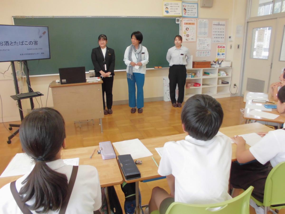 27日(木)の6限目、輪島市の能登北部保健福祉センターより3名の方をお迎えし、6年生の薬物乱用防止教室を行いました。今回は「酒やたばこの害」について考えました。そうしても酒やたばこといえば、お祭りと関連して話題が出てきましたが、実際の酒の缶やたばこを分解したもの、実物のタールなどを目にすると、子どもたちは大人になっても酒やたばこはほどほどにしようと考えていました。これを機会に、自分の健康についても考えることができるようになってくれたらと感じました。