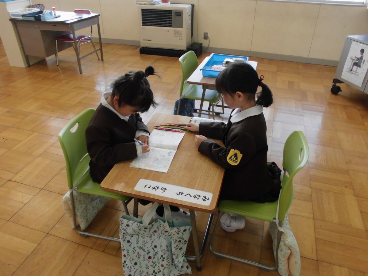 1年生教室では、担任の先生が車で、二人で楽しくぬり絵に取り組んでいました。こちらも朝からほっこりする素敵な場面でした。