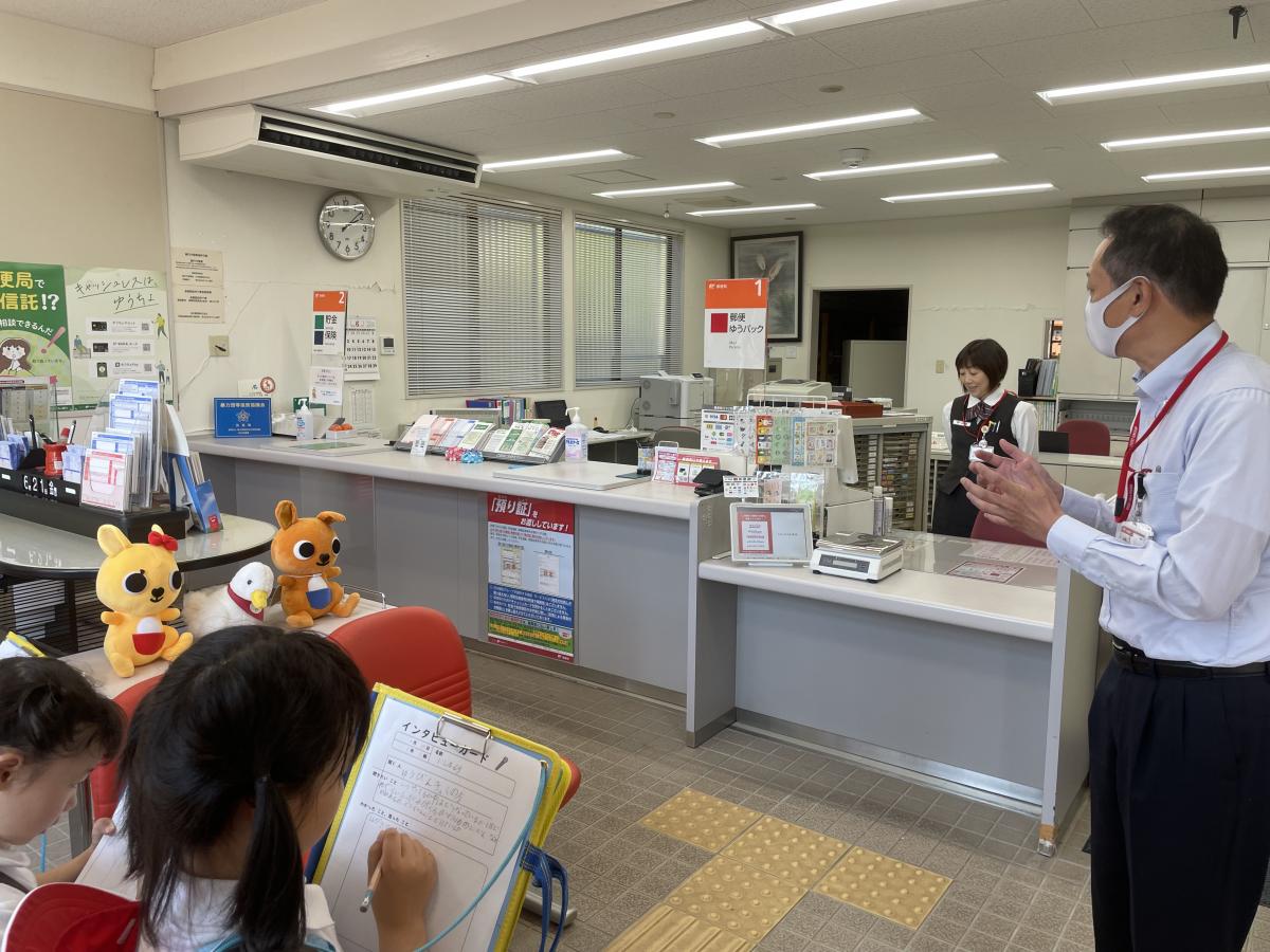 21日(金)の5限目、1・2年生は町探検で、正院郵便局さんにお世話になりました。最初に、局長さんに郵便局のお仕事のことや、郵便局を開いている時刻などを質問し、教えていただきました。その後、郵便局の中の様子を見学しました。いろいろな新しい発見があったようです。最後に自分たちが書いた手紙をポストに投函しました。1年生はお母さん宛、2年生は昨年お世話になった担任の先生や教頭先生へのお手紙でした。返事が来ることを楽しみにしている1・2年生でした。