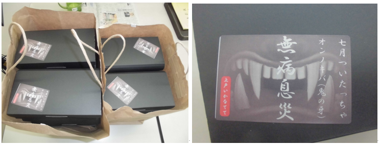 27日のお昼,正院公民館の主事さんが来校され,上戸公民館から子どもたちへのいただき物を届けていただきました。「オンノキバ」。「オンノキバ」とは,上戸地区に残る昔からの行事。正月に供えた餅を、7月1日に割って食べる行事です。硬くなった餅を、農作業に使う木づちでたたき割って食べます。割れたかけらが鬼の牙に見えることから「オンノキバ」と呼ばれています。残り半年の平穏無事や健康を願い、江戸期には珠洲の各家庭で盛んに行われていたとされています。カリポリとした音で体内の邪気を祓う意味もあるとのこと。