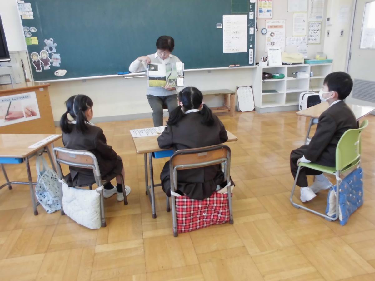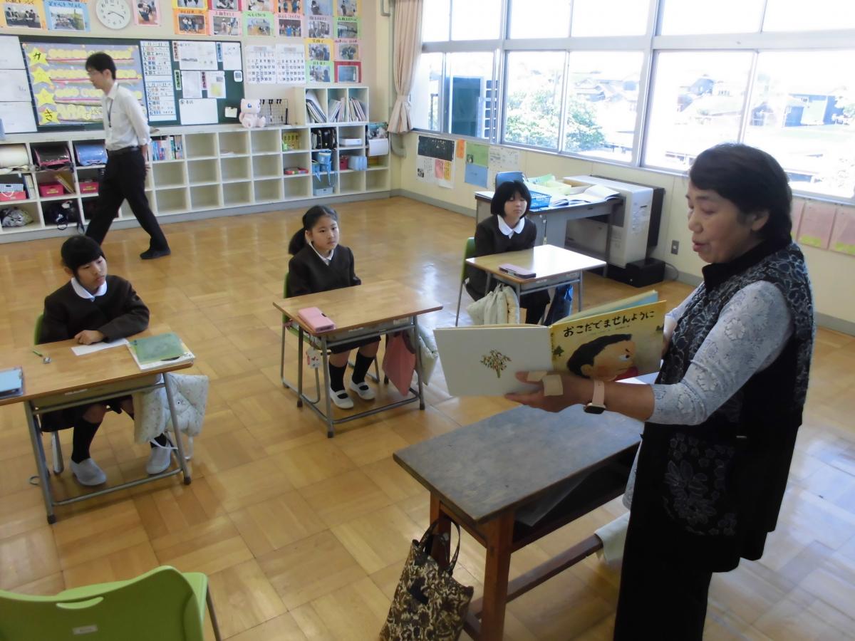 4年教室では、「おこだでませんように」の読み聞かせでした。「ぼくは いつも おこられる。」妹を泣かせて怒られて、女の子を驚かせて怒られて、友達に先に手を出して怒られて・・・。お母さんや先生にいつも大目玉をくらっているこんな男の子、いるいる。ついつい「何で怒られるような事ばかりするんだろう?」、「どうして何も言わないの?」なんて思ってしまう場面も。でも、この絵本の読み聞かせを聞いていて、はっとさせられたました。こんな風に思っていたなんて。最後に素直に喜ぶ「ぼく」の姿をみて思うのは・・・ぜひ読んでみてほしい絵本でした。