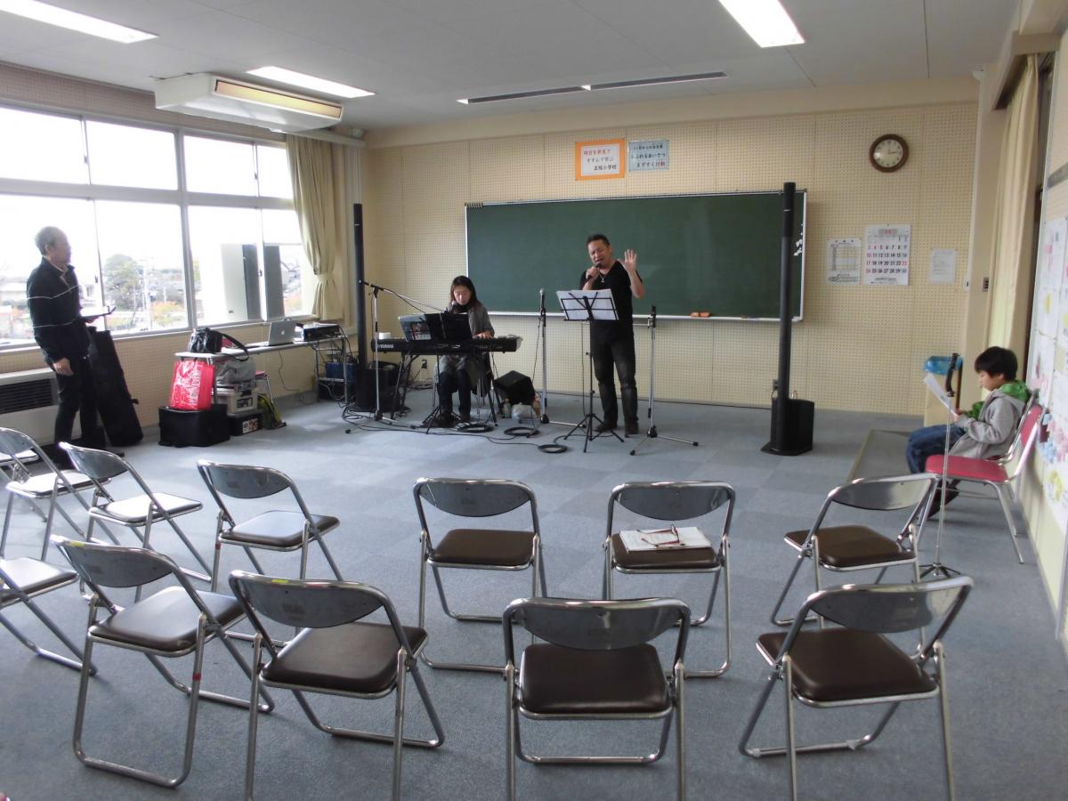 当初はご挨拶のための来校予定でしたが、ぜひ子どもたちに歌を歌ってほしいとお願いし、ミニコンサートが実現することとなりました。10時30分頃ご来校され、早速会場となる会議室で音合わせ等の準備をされました。12時ごろのぞくと、まだ熱心に音合わせ中。入念なご準備に頭が下がる思いでした。