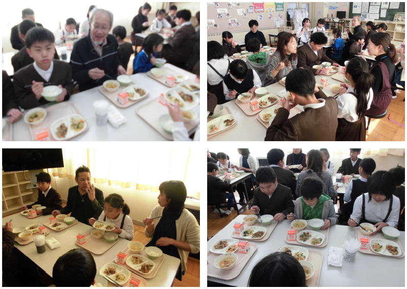給食は子どもたちと一緒にとお願いし、各テーブルにお一人ずつすわっていただき、子どもたちと会話しながら食べていただきました。子どもたちも嬉しそうで、みんなで楽しい時間を過ごすことができました。