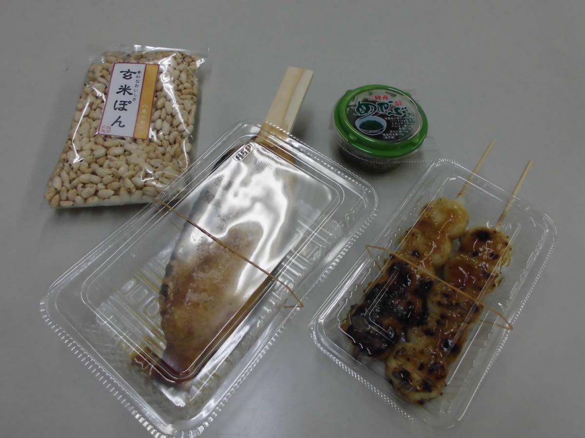 ⑤本日の炊き出しの方より…みたらし団子や五平餅、また昼食の付け合わせ等としてめかぶ・スイートポテト・酢和え・漬物・ポン菓子をいただきました。