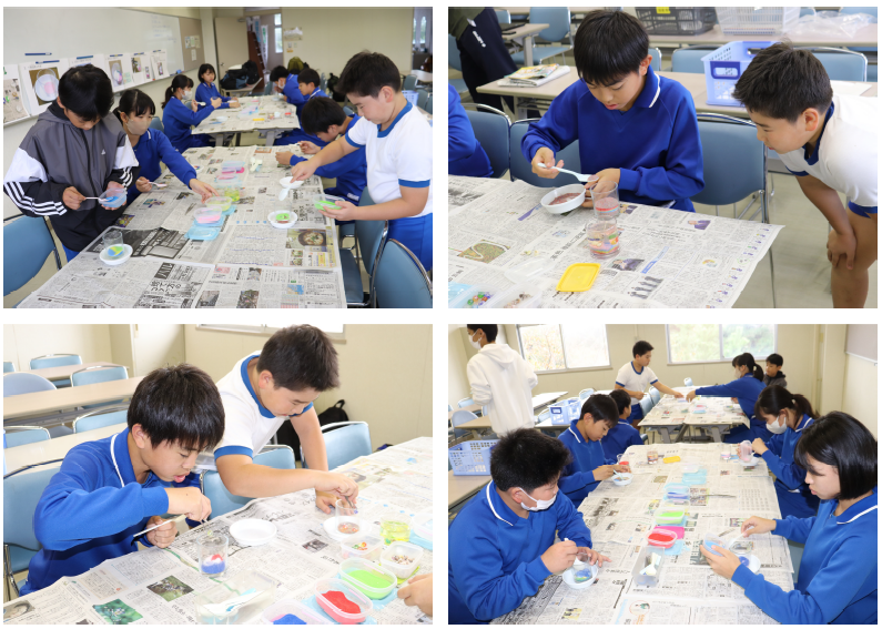 その後午前中は、クリアキャンドルづくりに挑戦しました。キャンドルのグラスに、カラー砂や貝殻をきれいに敷き詰め、その上に溶かしたロウを入れました。