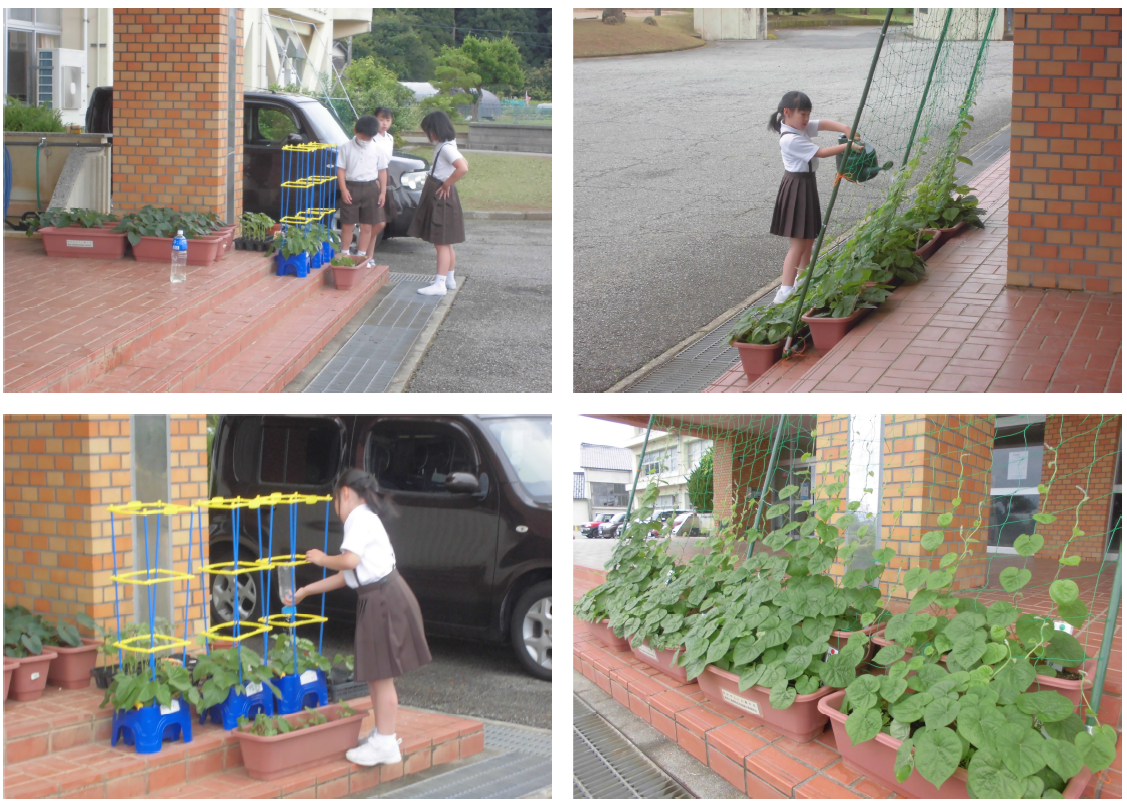 23日(金)の朝,子どもたちは登校するなり,すぐ玄関で育てている植物への水やりが始まります。この日は登校した1年生が,けんちゃんの朝顔,さつまいも,自分の朝顔の水やりをてきぱきこなす姿がとっても微笑ましく感じました。その後,その1年生は走って学校裏の畑へ水やりに!すごいなぁと感じる時間でもありました。
