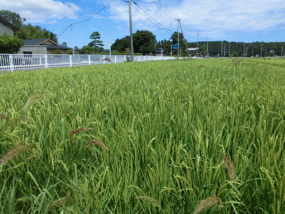 9日(水)、今日も朝から暑い日になっています。学校田の様子を見に行くと、この暑さの中でも稲たちは元気に育っています。すでに穂をつけ、花が咲いた様子も見えました。2学期にはみんなで稲刈りを行う予定です。たわわに実った稲を刈り取りが楽しみになってきました。