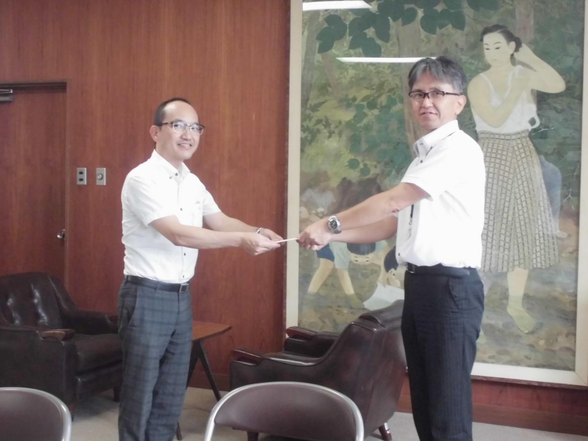 9日(水)の午後、富山県のNPO法人『大空へ飛べ』の皆様3名が来校され、寄付金が届きました。先日行った防災のイベントで、本校への募金を集めていただいたそうで、約35000円を直接持ってきて下さいました。暑い中の来校に感謝の意をお伝えするとともに、通常通りに戻った校舎の様子も少し見ていただきました。 帰り際に旧正院小体育館の様子に気づかれ、地震の被害の大きさも感じられていました。この寄附金は、市の教育基金として適切に活用させていただく予定です。多くの方の心のこもった寄附金、本当にありがとうございました。