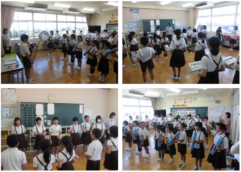 その後は9月の運動会に向けた鼓笛練習。熱中症対策として、時間を早め、扇風機を使用し、こまめに水分補給・休憩をしながら行いました。暑い中での子どもたちのきびきびした行動に元気をもらいました。後半は、クーラーの効いた教室で鼓笛・演奏練習。あの6月のパレードを彷彿させる元気な演奏を聴くことができました。