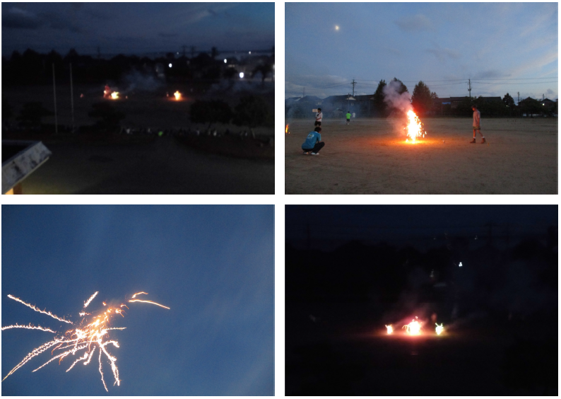 後半は「花火大会」です。PTA役員のお父さんたちがみんなで分担し、いろいろなしかけを工夫しながら、グラウンドから多くの素敵な花火が打ち上げられました。夏休みの終盤に、みんなで夏の夕暮れの素敵な時間を共有できたと思います。