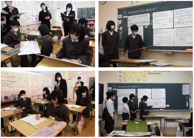 5限目は研究授業、学校職員も含めて全員で5年算数の授業を見ていただきました。単元は平均、仮の平均を用いていかによりよく解決すればよいかを考える授業でした。一番よいと思ったのは、全員でよりよい方法は何かを話し合う場面です。あ~でもない、こ~でもないと話し合う姿に5年生の大きな成長を感じました。