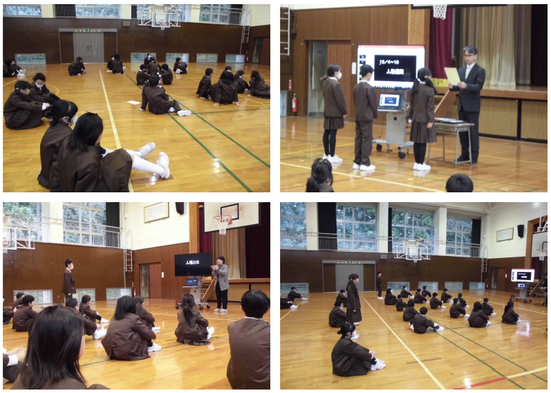 最後に12月4日から始まる人権週間に向けて、人権担当の職員からお話がありました。人権って何?差別ってどういうこと?学校の中でおこりそうな差別は?等のお話を聞きました。みんなが仲良くできるように、互いを思いやる行動ができればいいなと感じて話を聞いていました。
