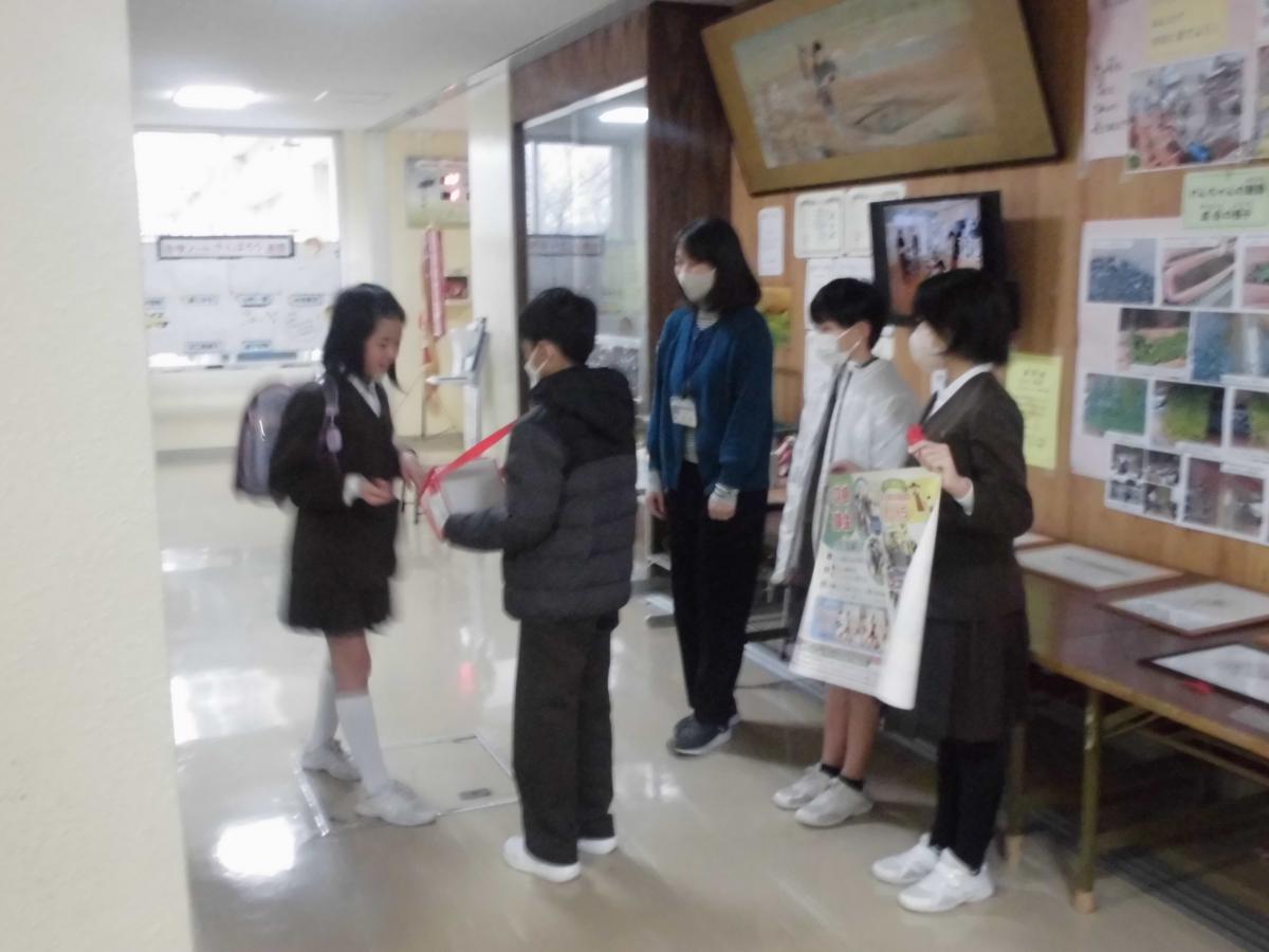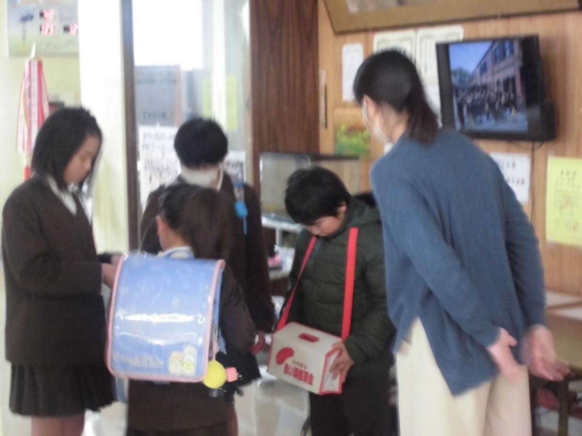 29日(水)の朝、今日明日と児童会の子どもたちは、赤い羽根共同募金活動に取り組みました。悪天候の中での登校でしたが、多くの子どもたちは募金のためのお金をもって、嬉しそうに募金する姿がありました。募金を集めている子どもたちも、緑の羽根募金活動で要領が分かったようで、大きな声で「赤い羽根募金にご協力お願いします!」と声をかける姿が見られました。明日まで続く募金活動、最後までやりきってほしいと思います。