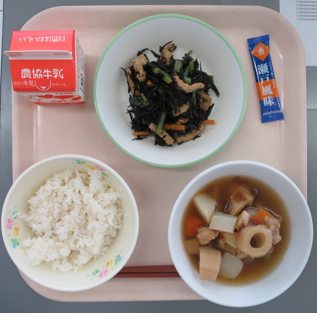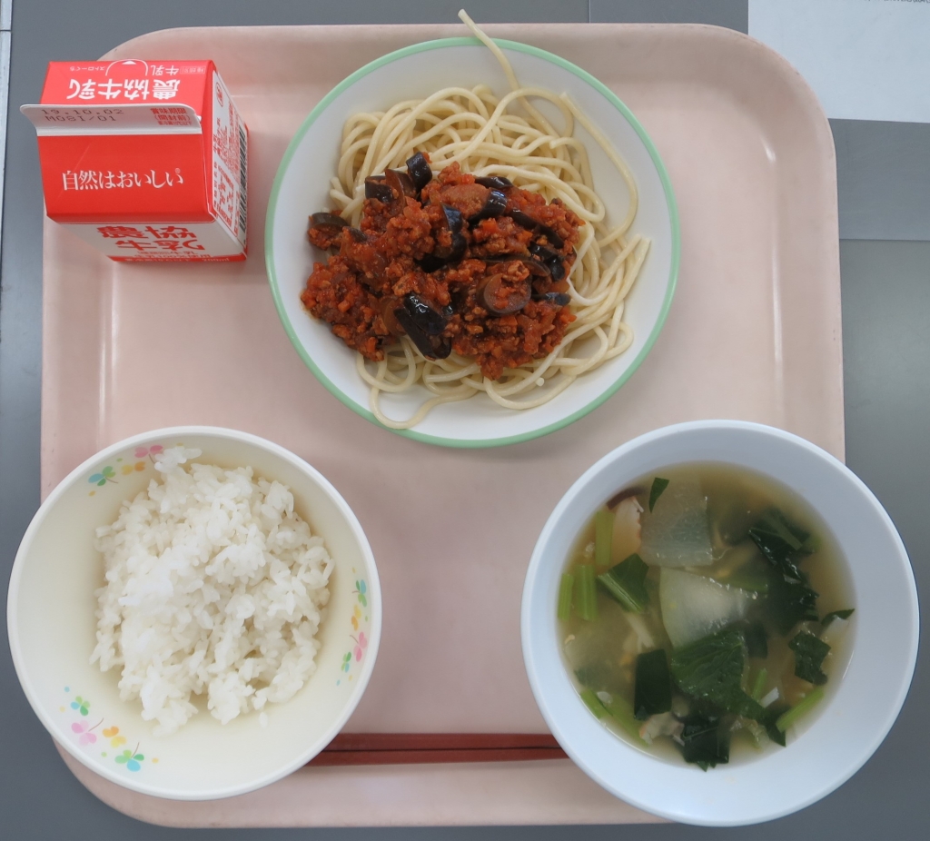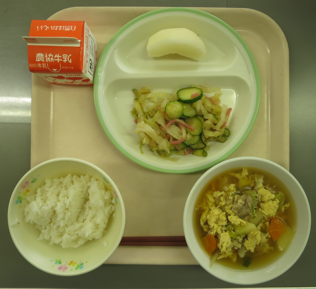 ~麦ごはん、ミートローフ、きゅうりの浅漬け、