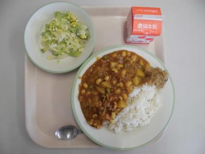 ~ポークビーンズカレー、グリーンサラダ、菊水漬け、牛乳~