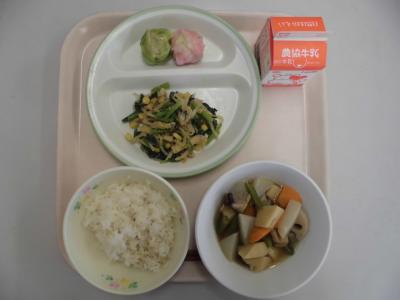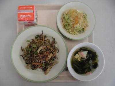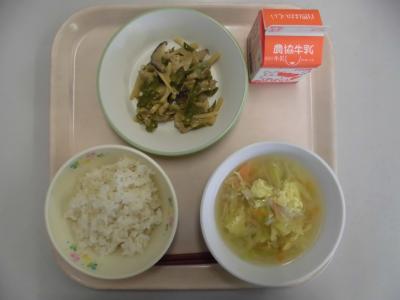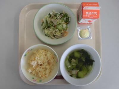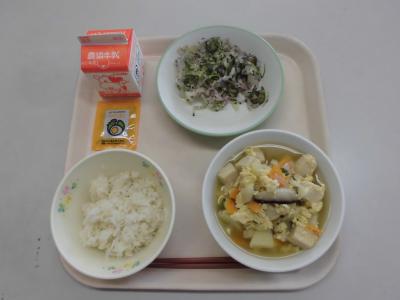 ~わかめごはん、かぼちゃコロッケ、切り干し大根サラダ、野菜スープ、牛乳~
