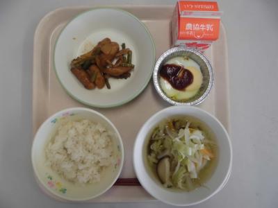 ~麦ごはん、チンジャオロース、かにかまと卵のスープ、牛乳~