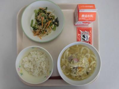 ~麦ごはん、親子うどん、ツナと青菜の和え物、ふりかけ、牛乳~