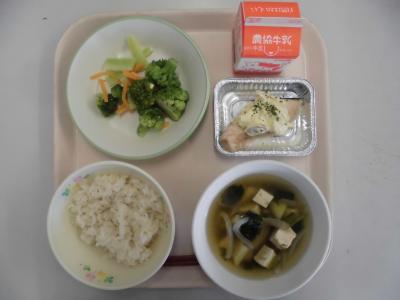 ~麦ごはん、鮭のマヨネーズ蒸し、ブロッコリーのサラダ、具だくさん汁、牛乳~