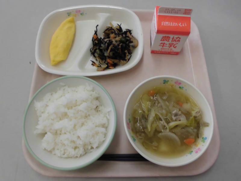 今日の給食は、ご飯,オムレツ,ひじきの炒り煮,豚汁,牛乳でした。ひじきの炒り煮は、あまり得意ではない児童が多かったようですが,残さず食べていました。ごちそうさまでした。