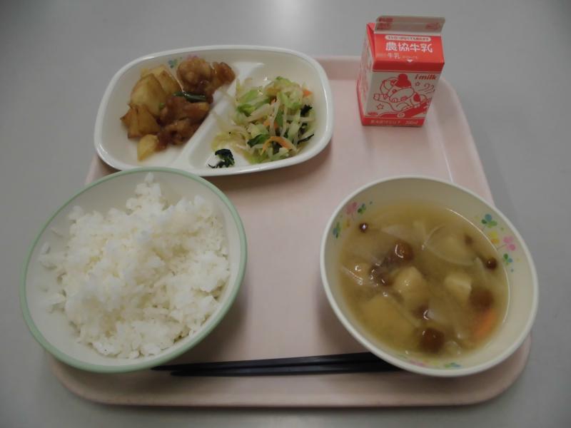 今日の給食は、ご飯,鶏肉とじゃがいもの揚げ煮,おひたし,みそ汁,牛乳でした。鶏肉とじゃがいもの揚げ煮は、ご飯に合う大好きなおかずだったようでした。ごちそうさまでした。