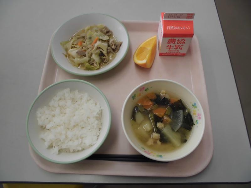 今日の給食は、ごはん、五目野菜いため、みそ汁、オレンジ、牛乳です。
