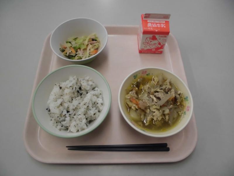 今日の給食は、わかめごはん、五色和え、柳川風煮、牛乳です。