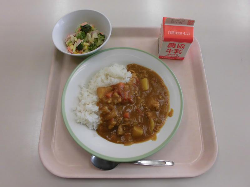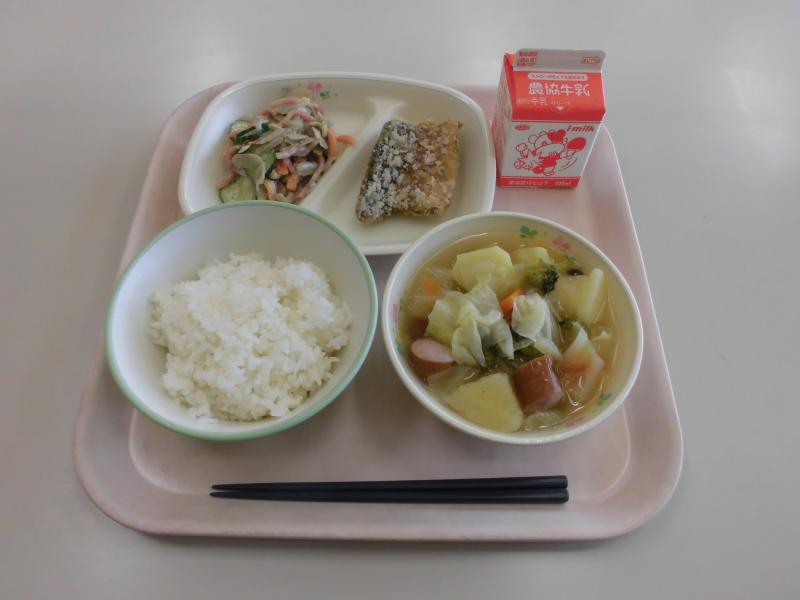 今日の給食は、ごはん、魚の竜田揚げ、ごぼうサラダ、ポトフ、牛乳です。