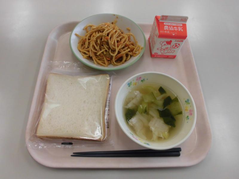 今日の給食は、食パン、ミートソーススパゲティ、肉入りワンタンスープ、牛乳です。