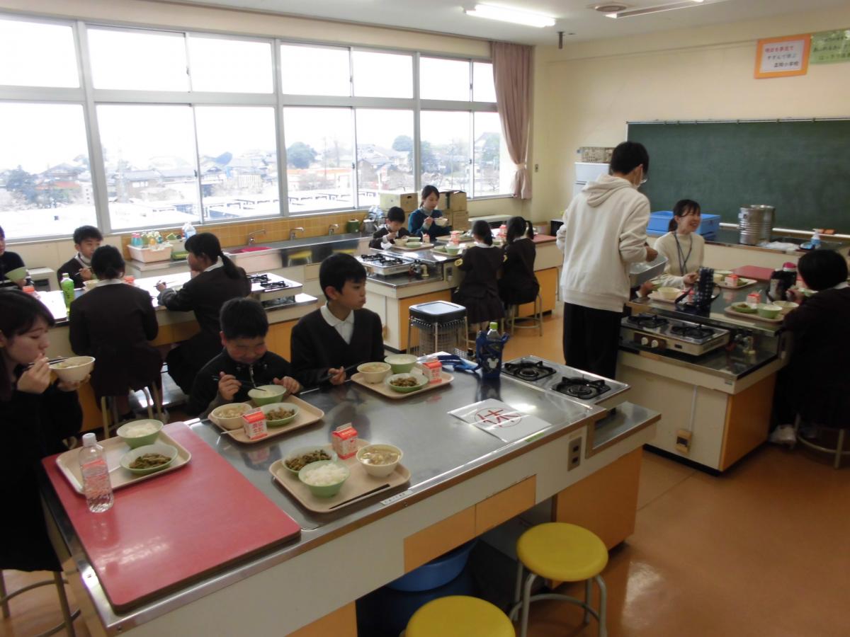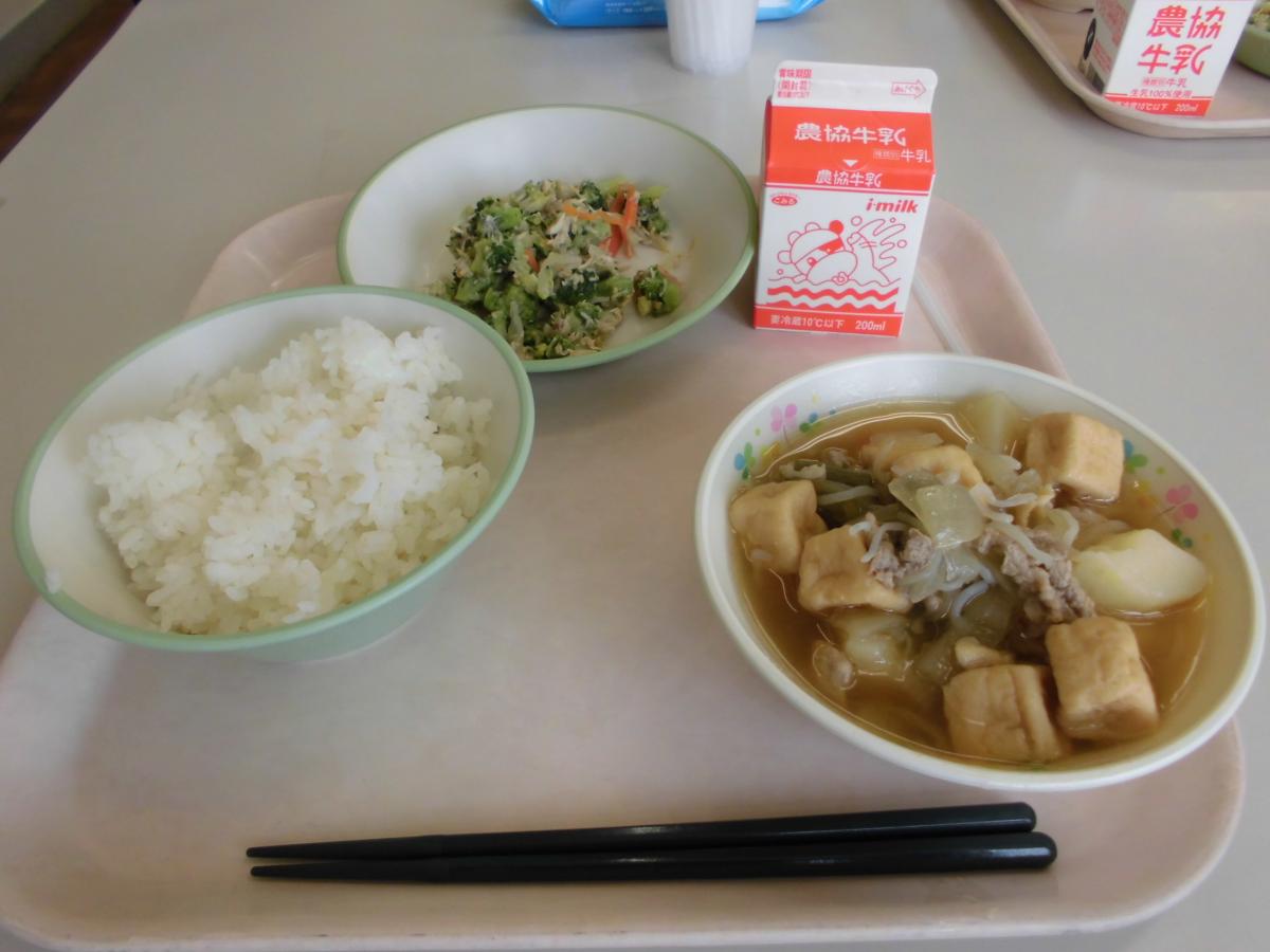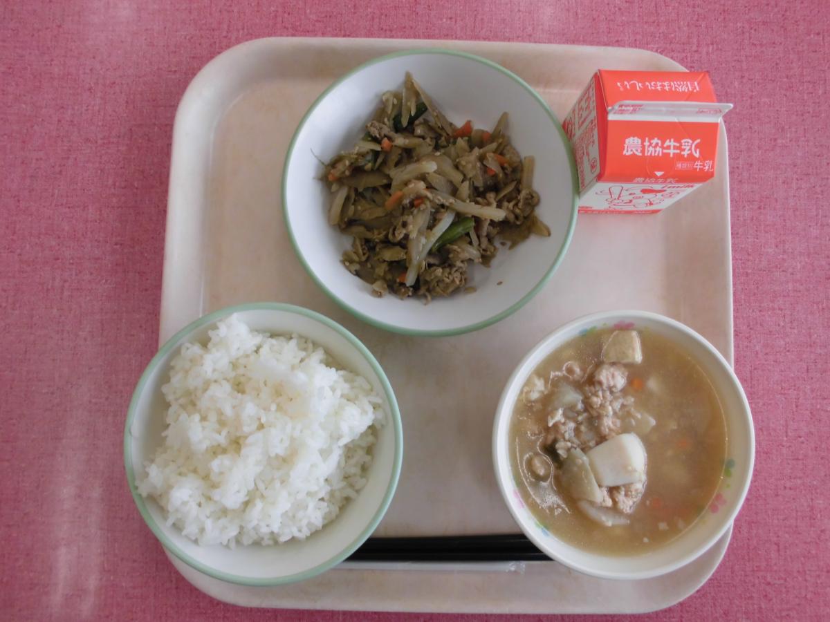 今日は給食が再開して2日目でした。献立は、ごはん、かわりきんぴら、大根とひき肉のうま煮、牛乳でした。給食らしいメニューで、栄養バランスもよさそうです。みんなもりもり食べていました。