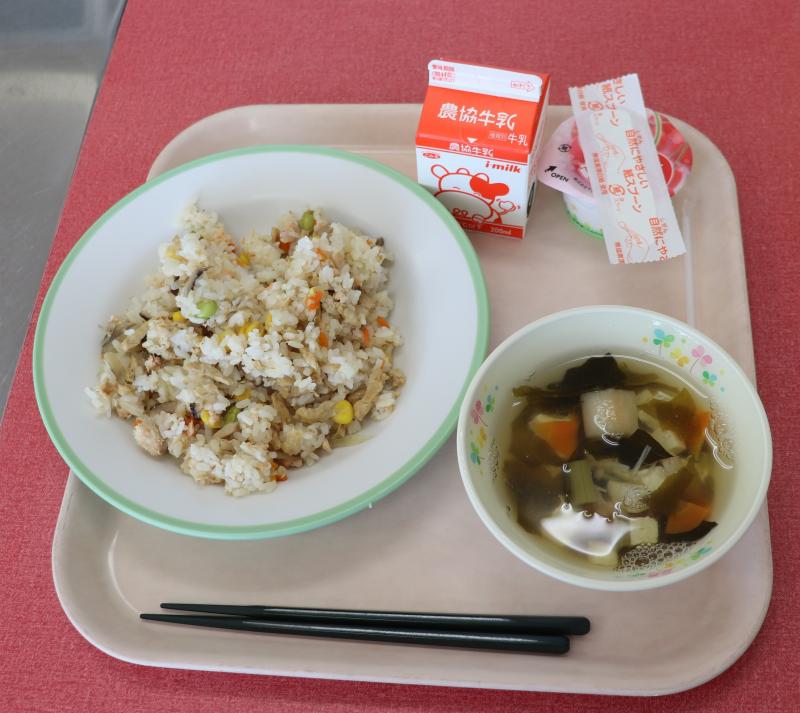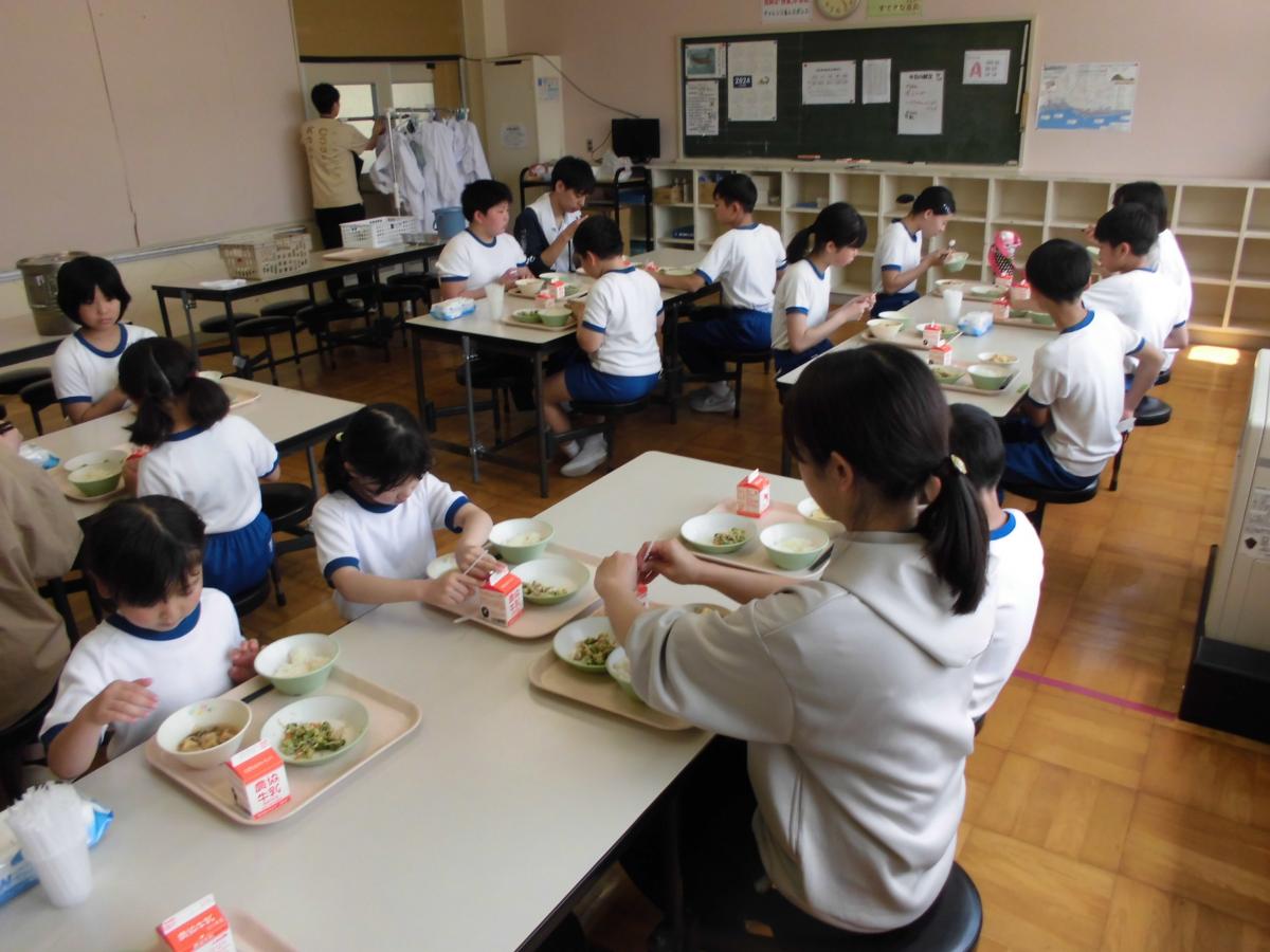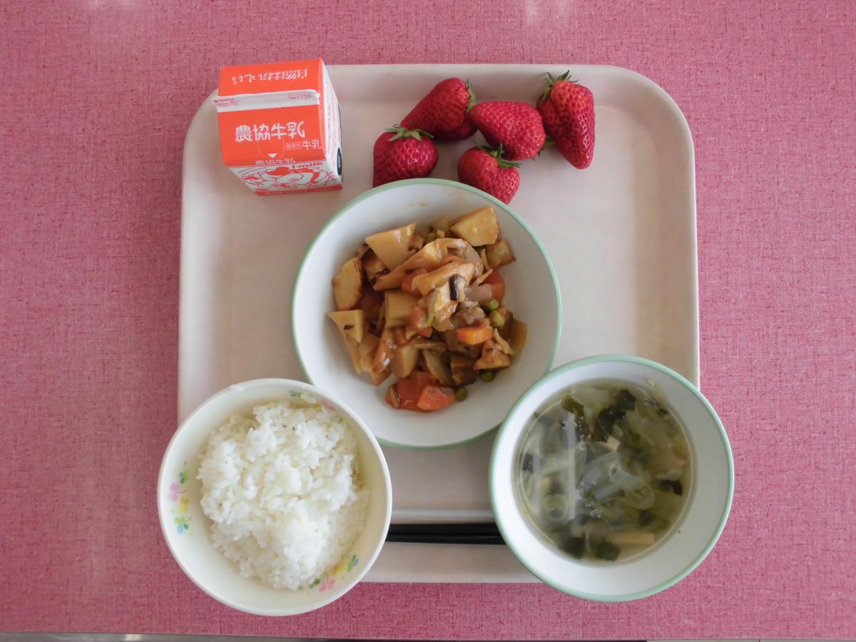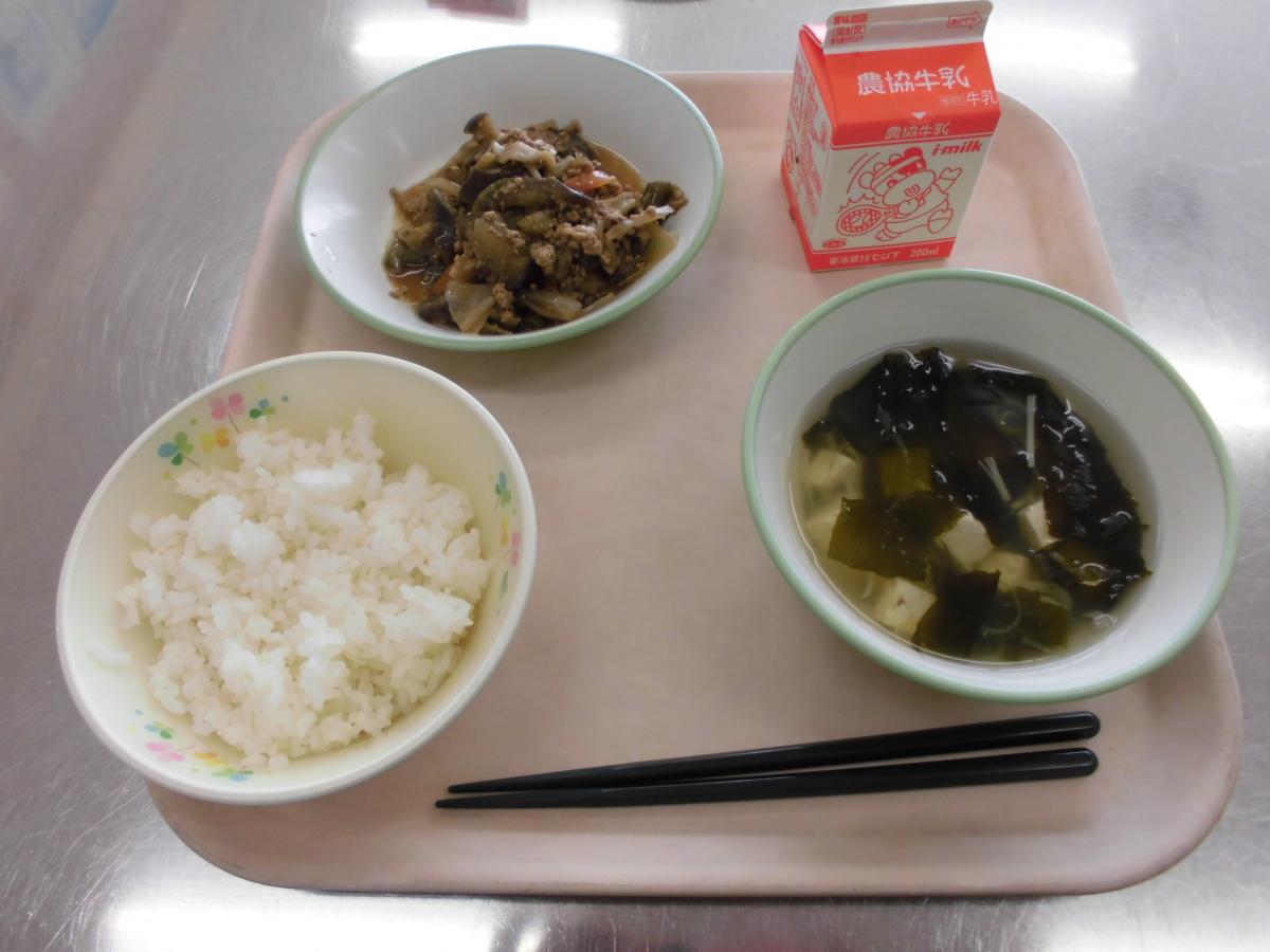 今日のメニューは、ご飯、なすの肉みそ炒め、とろみわかめスープ、牛乳でした。一昨日いただいたいちごもいただきました。なすが苦手な児童が多かったようですが、食べると『美味しい!』といいながら食べていました。ごちそうさまでした。