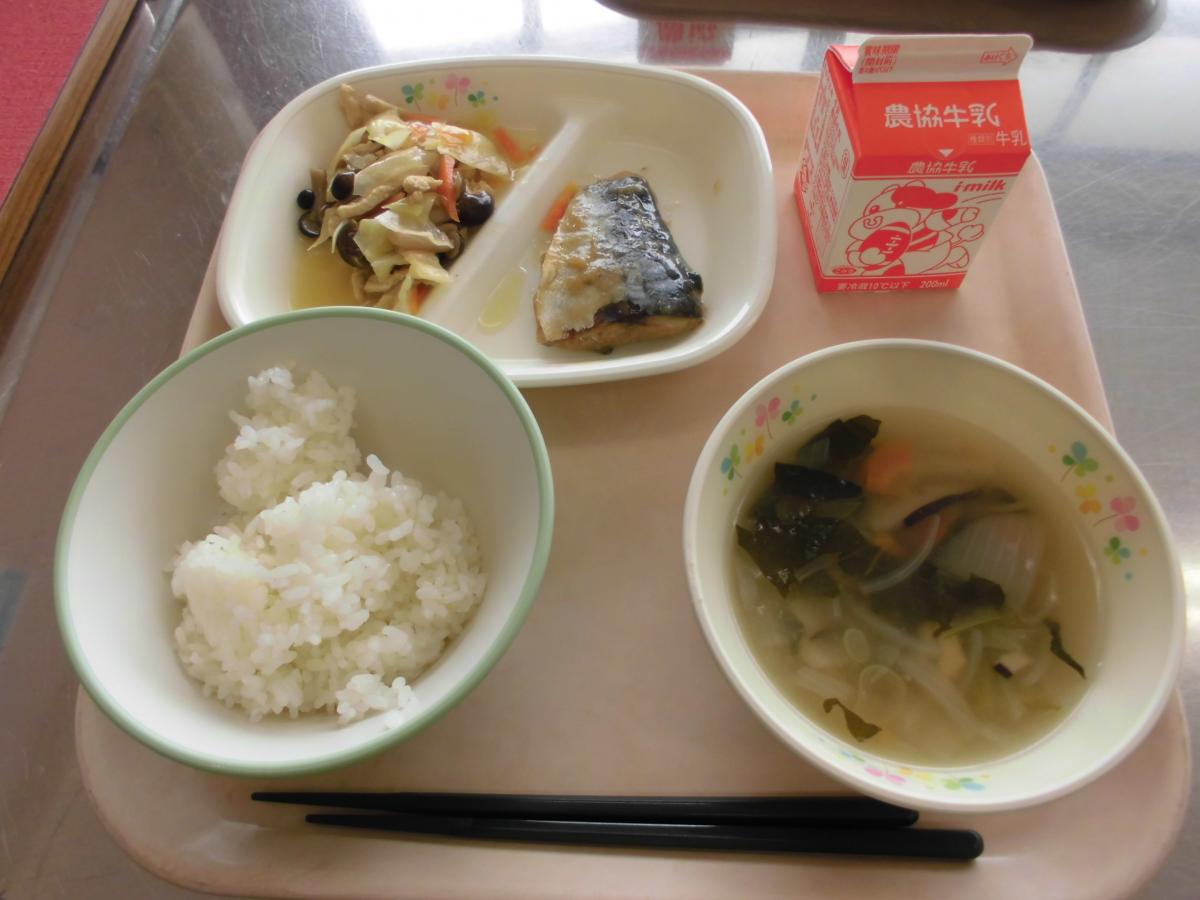 今日のメニューは、ご飯、さばの味噌煮、小松菜のみそ汁、キャベツ煮びたし、牛乳でした。『さばの味噌煮、おいしい!』と言いながら食べていました。ごちそうさまでした!