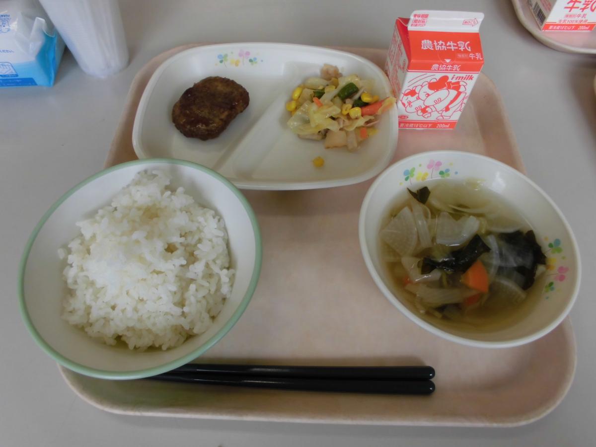 今日のメニューは、ご飯、ハンバーグ、彩り野菜のソテー、大根のコンソメスープ、牛乳でした。ハンバーグはみんな大好き。味わって食べていました。ごちそうさまでした!