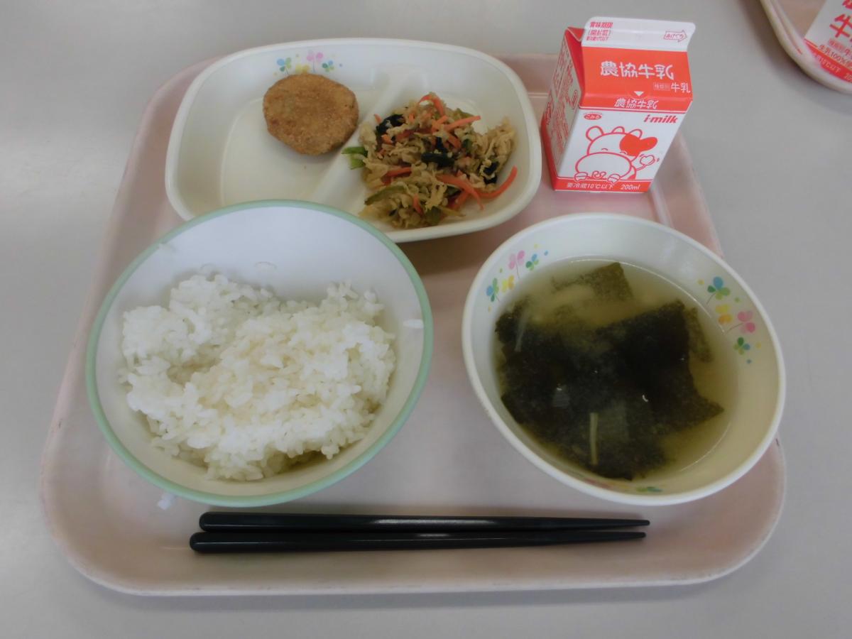 今日のメニューは、ご飯、メンチカツ、切干大根のピリ辛炒め、わかめと揚げのみそ汁、牛乳でした。2年生が「今日のメニューはすぐに食べられそう!」とつぶやきながら味わって食べていました。ごちそうさまでした。