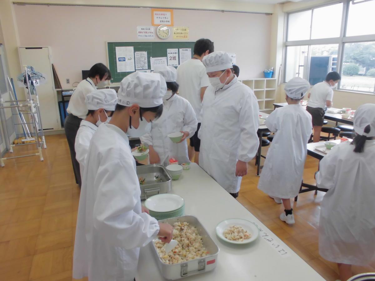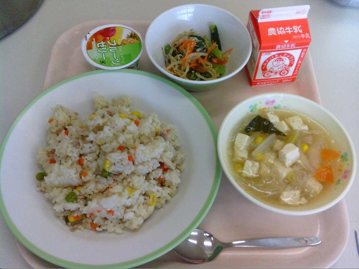 本日から2学期が始まり、久しぶりの給食です。今日のメニューは五目チャーハン、三食ナムル、はるさめスープ、フルーツゼリーでした。児童が3人増えてよりにぎやかに給食を味わい、楽しむことができました。ごちそう様でした。