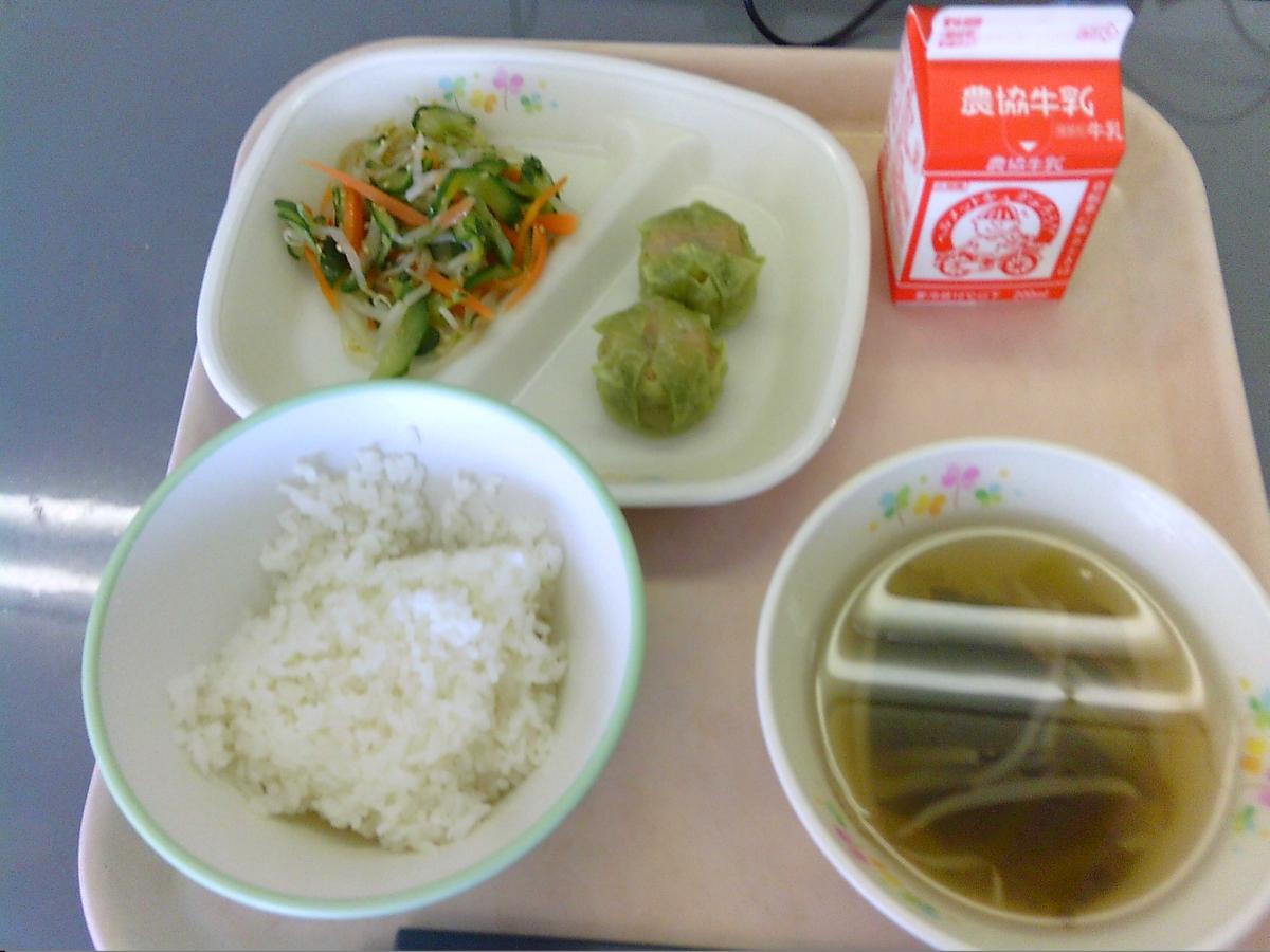 4日(水)、今日のメニューは、ご飯・枝豆シューマイ・もやしのナムル・中華わかめスープ・牛乳でした。枝豆シューマイはあまり食べたことのない味だったようで。子どもたちは「美味しい!」とつぶやきながら食べていました。ごちそうさまでした。