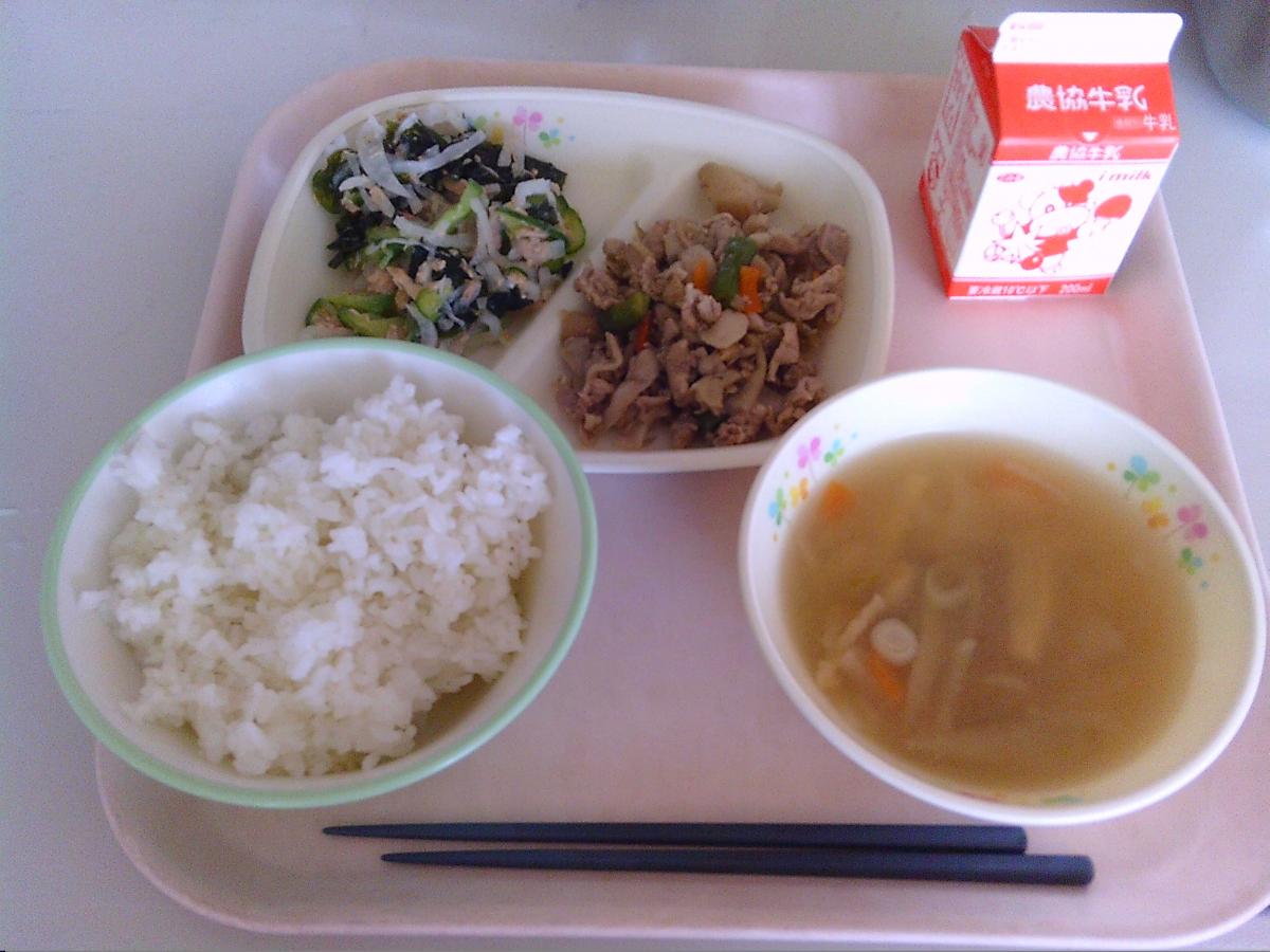 今日のメニューは、ご飯・鶏肉の香草焼き・ポテトサラダ・オクラともずくのスープ・牛乳でした。4限目に鼓笛練習でがんばった子どもたちに、贈り物のジュースも1本つけました。よくがんばった後で、みんなもりもり食べていました。もずくが初めてなのか苦戦している児童もいましたが。ごちそう様でした!