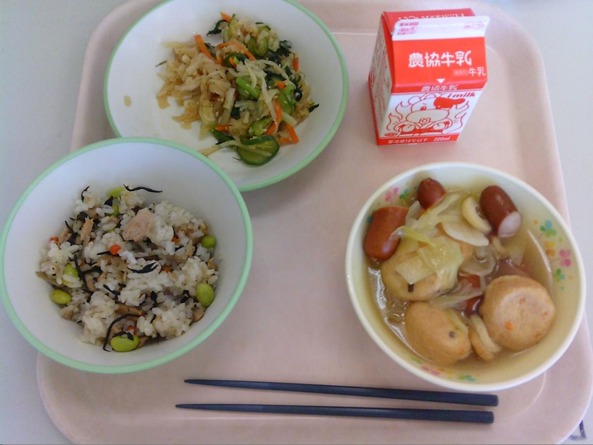 今日のメニューは、ひじきツナごはん・はりはり和え・洋風おでん・牛乳でした。洋風おでんの温かさが美味しく感じるのは、季節の移り変わりなのかなぁと感じながら、今日も美味しくいただきました。ひじきツナごはんもなかなかの美味でしたよ。ごちそうさまでした。