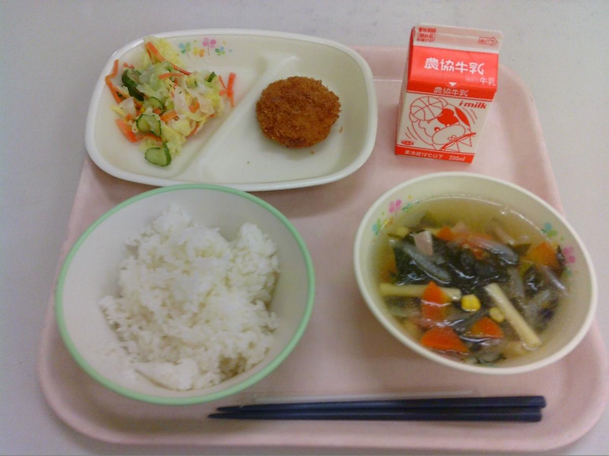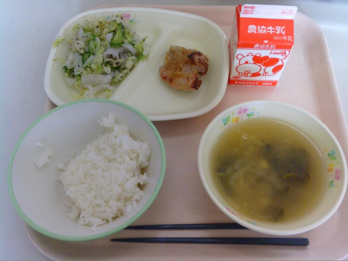 今日のメニューは、ご飯・チキンカツ・コールスローサラダ・マカロニコンソメスープ・牛乳でした。残ったチキンカツはみんなでじゃんけんして分けていただきました。コンソメスープにマカロニが入っているのが珍しかったようですが、美味しそうに食べていました!今日もごちそう様でした!
